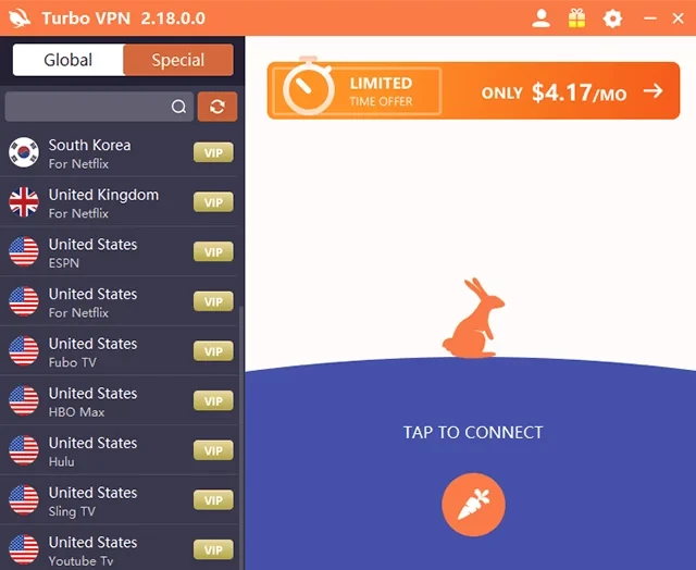 Инструмент предлагает быстрые услуги, предлагая простой и удобный интерфейс. Просто нажмите кнопку и перейдите на сайт или в страну, которую вы хотите просмотреть. Более того, Turbo VPNнадежно подходит для любого типа интернет-подключения, то есть Wi-Fi, LTE, 3Gи всех мобильных носителей данных.